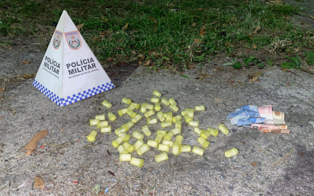 As buscas continuaram em um terreno baldio próximo, de onde dois dos suspeitos haviam saído momentos antes da abordagem. No local, os policiais localizaram uma sacola contendo o material ilícito.