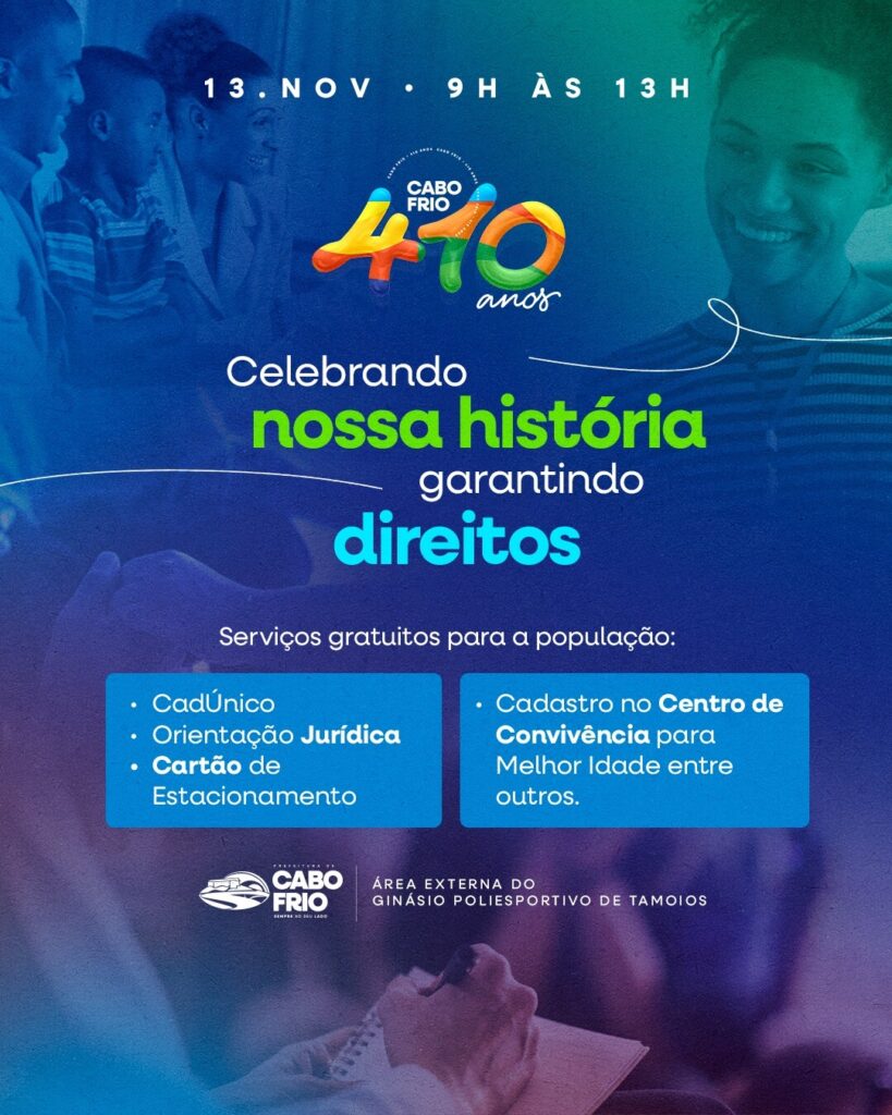 Cabo Frio comemora seu aniversário com uma iniciativa voltada para a população de Tamoios. A Prefeitura, através da Secretaria de Assistência Social e em colaboração com a Secretaria de Esportes, promove a ação social “Cabo Frio 410 anos – Celebrando nossa história, garantindo nossos direitos”. O evento acontece na quinta-feira (13), das 9h às 13h, na área externa do Ginásio Poliesportivo em Tamoios.