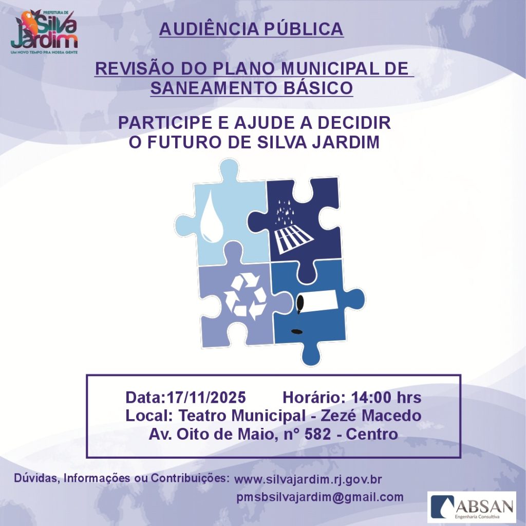 A Audiência Pública para a aprovação do relatório final do PMSB está agendada para o dia 17 de novembro de 2025, às 14h, no Teatro Municipal Zezé Macedo, localizado na Avenida Oito de Mario, nº 582, no Centro de Silva Jardim. Durante o evento, serão apresentadas as propostas e informações do PMSB, e os participantes terão a chance de discutir e contribuir com o documento.