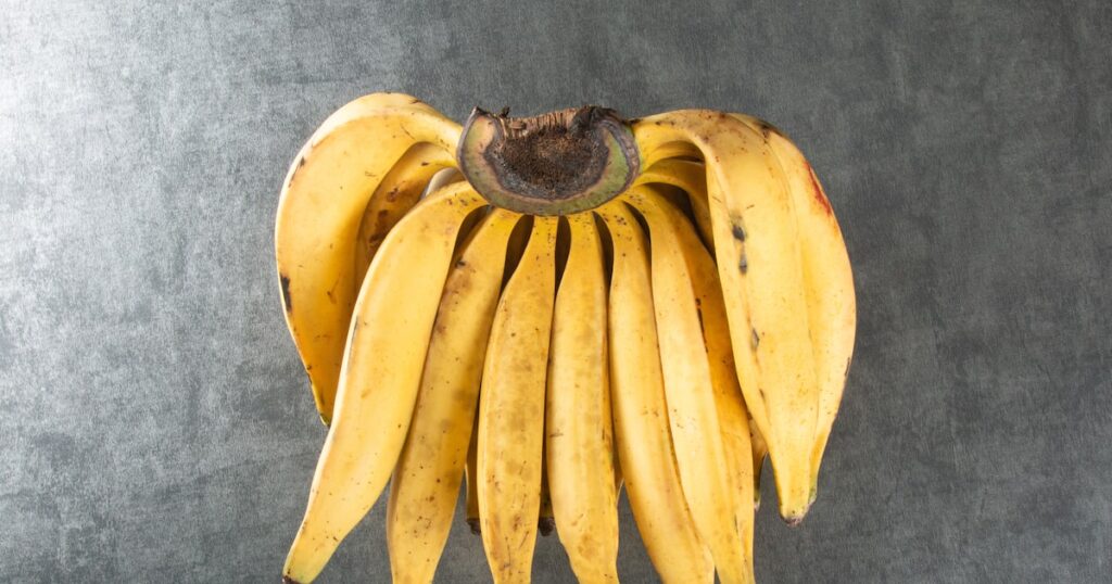Cacho de banana-da-terra em fundo cinza. Foto: Gustavo - stock.adobe.com