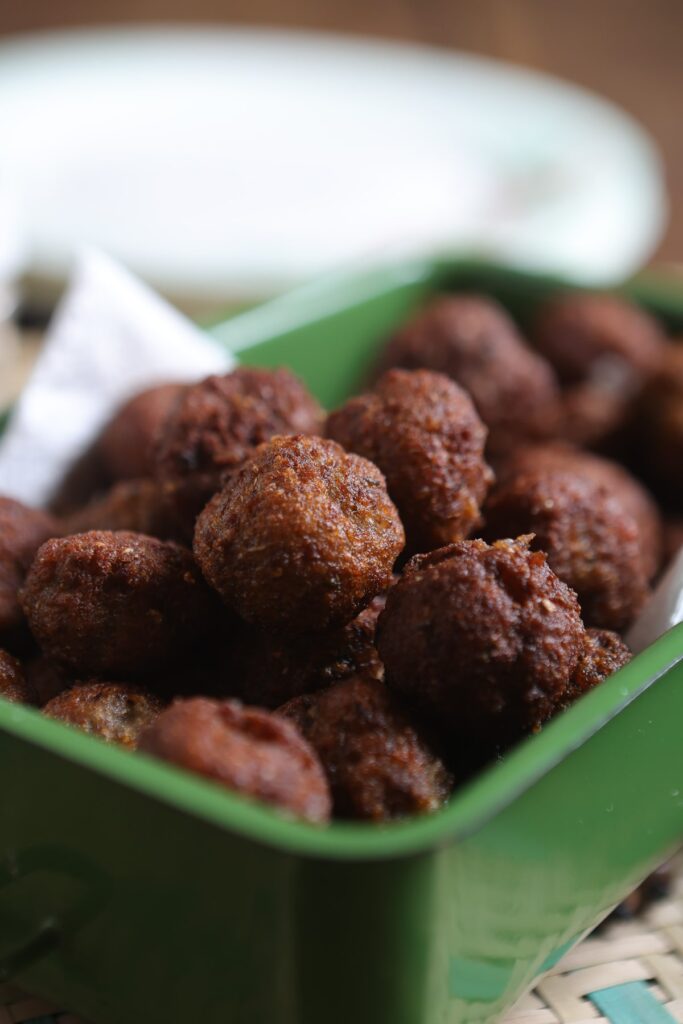 Quase na hora de servir, aqueça o óleo em uma frigideira grande. Frite os bolinhos em quantidade suficiente para não aglomerá-los, até que fiquem dourados e crocantes por fora. Após a fritura, coloque-os sobre papel absorvente para retirar o excesso de óleo. Sirva os bolinhos quentes, acompanhados de molho de pimenta para um toque especial.