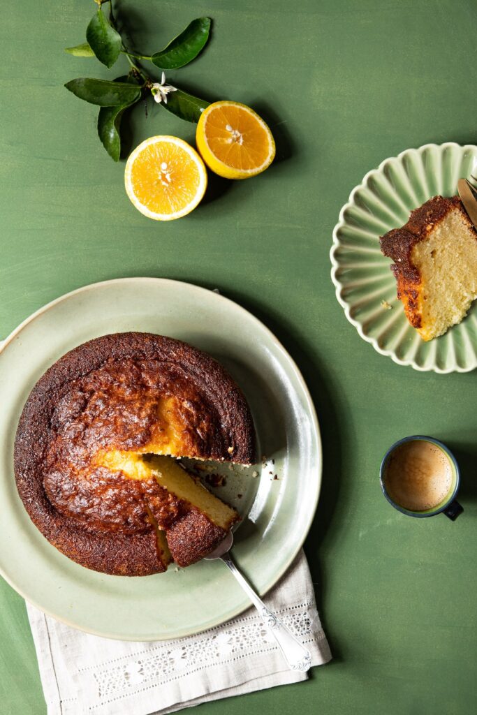 Para a calda, misture o suco de laranja com o açúcar até que a mistura fique esbranquiçada. Com o bolo já desenformado, pincele metade da calda sobre a superfície do bolo e aguarde a absorção. Em seguida, aplique o restante da calda, permitindo que o bolo absorva os sabores cítricos. Deixe secar levemente antes de servir, garantindo que o bolo esteja morno e pronto para ser degustado.