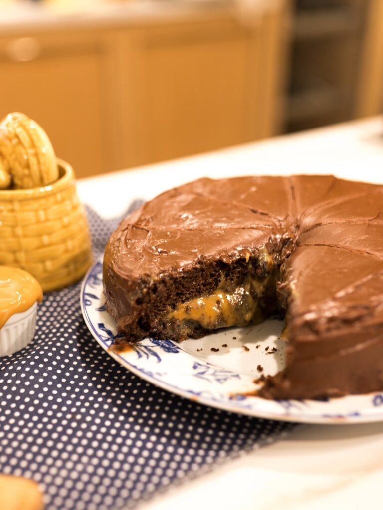 Doce de leite: Aproximadamente 400g, de boa qualidade e consistência firme, para o recheio e parte da cobertura. Pode ser um doce de leite de pote ou leite condensado cozido na panela de pressão.