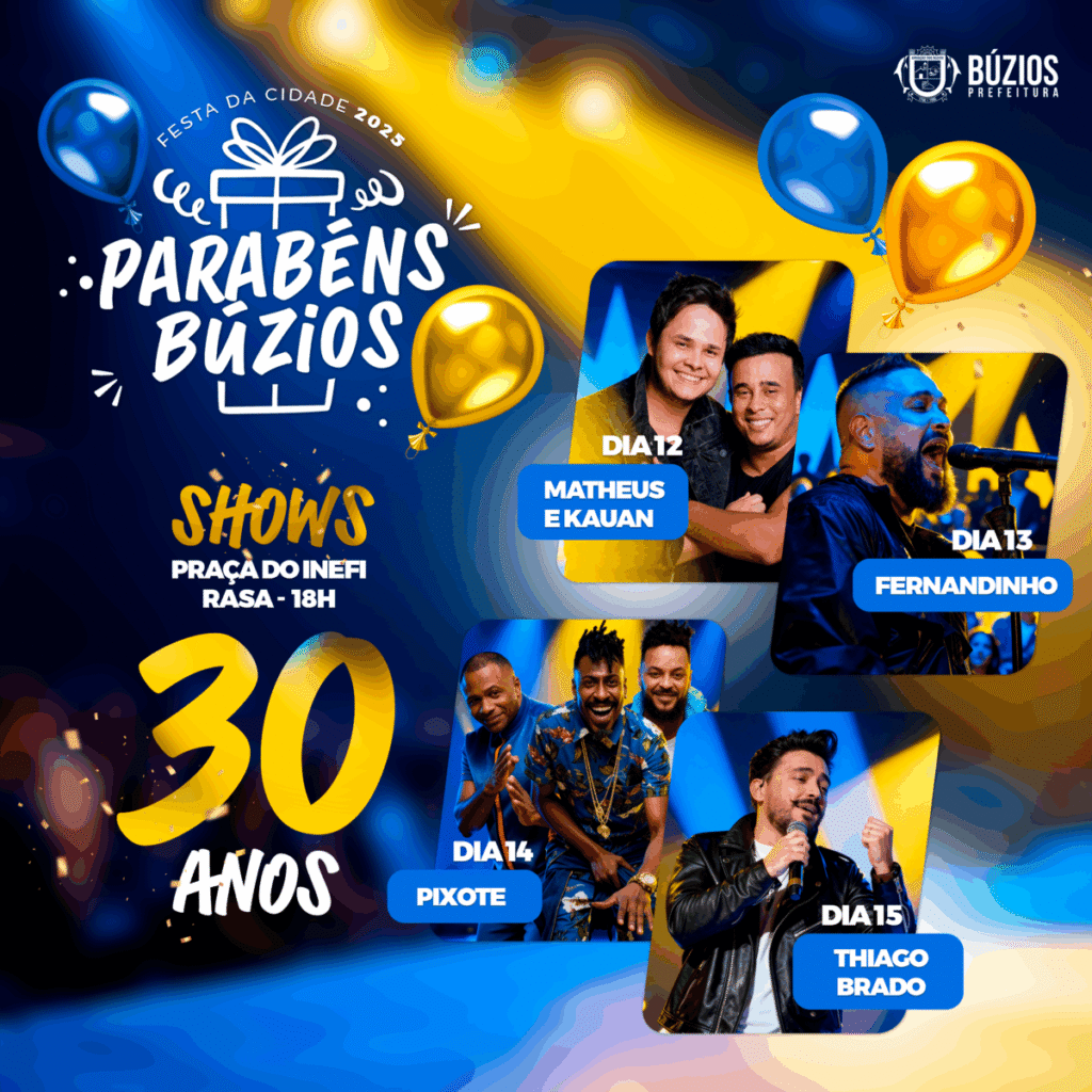 Búzios celebra seu 30º aniversário de emancipação política com uma programação especial de shows gratuitos na Praça Tia Uia, localizada no bairro da Rasa. A prefeitura municipal organiza o evento que promete agitar a cidade entre os dias 12 e 15 de novembro.