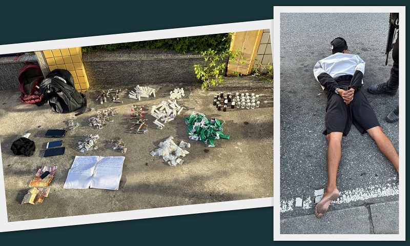 No momento da abordagem, o motorista se identificou como policial militar. Ele relatou que foi rendido pelo criminoso que estava no carona, o qual o obrigou a dirigir para retirá-lo da área do cerco. O passageiro, que vestia casaco branco e touca preta conforme a denúncia inicial, foi revistado, e com ele foi encontrada uma mochila contendo farto material entorpecente.
