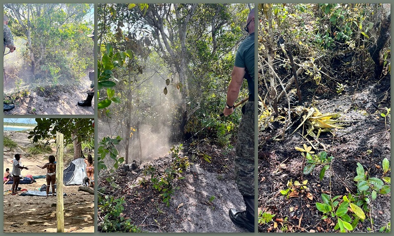 Operação na manhã desta sexta-feira (12) evitou que fogo se alastrasse na trilha da ARIE de Itapebussus; acampamentos irregulares também foram removidos.