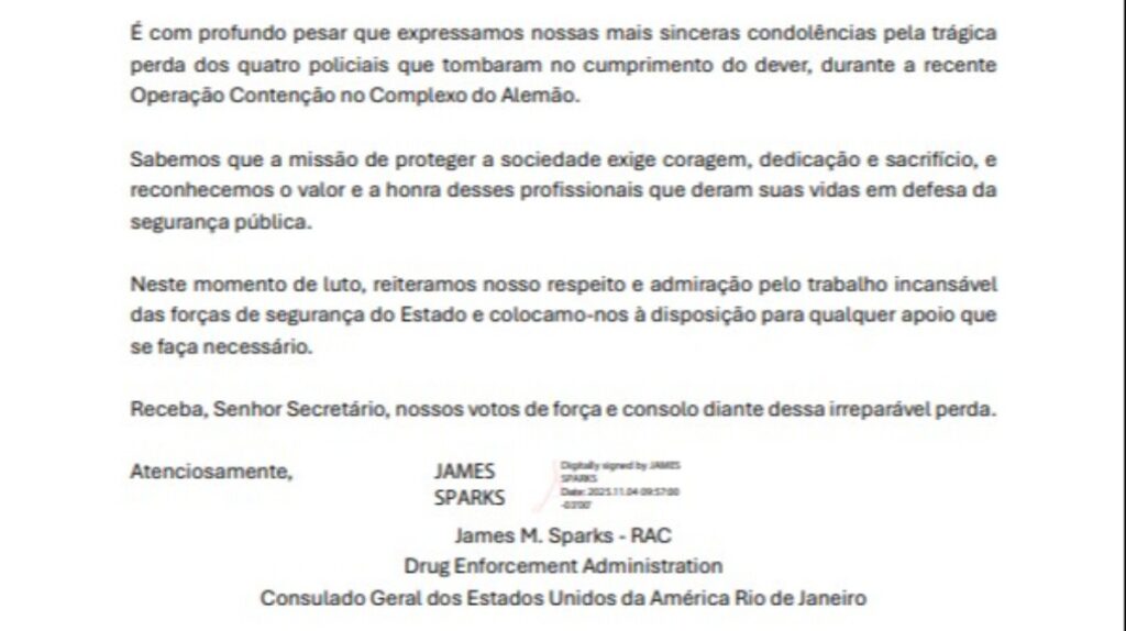 A missiva, identificada como documento do Departamento de Justiça dos Estados Unidos, com menção ao Consulado Geral dos Estados Unidos da América Rio de Janeiro na assinatura de Sparks, reitera o “respeito e admiração pelo trabalho incansável das forças de segurança do Estado”. O representante da DEA se colocou à disposição para oferecer apoio, expressando votos de força e consolo diante da “irreparável perda”.