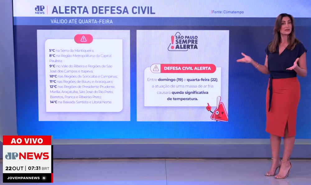 Em São Paulo, o alerta de frio emitido pela Defesa Civil, com validade até hoje, indicava temperaturas entre 5°C na Serra da Mantiqueira e 14°C na Baixada Santista. A previsão é que as temperaturas comecem a subir nas tardes, mantendo as manhãs ainda frias.