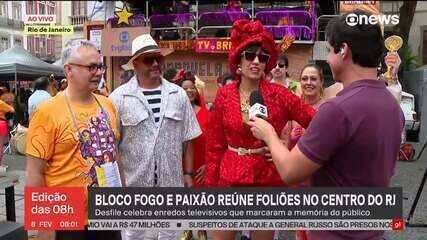 O bloco Fogo e Paixão se destacou no centro do Rio, reunindo foliões em um ambiente festivo e acolhedor. Mari Guedes, cantora do bloco, expressou a emoção de ver a praça lotada, ressaltando a importância do evento para a cultura carioca. 'A gente adora ver essa praça cheia. A gente se prepara o ano inteiro para isso, trazer essa alegria, trazer um pouco dessa música brega, que é muita paixão, muito amor, e a novela no Brasil que acompanha a vida de todos os brasileiros', afirmou Mari, que neste ano desfilou como Viúva Porcina, uma personagem icônica da televisão brasileira.