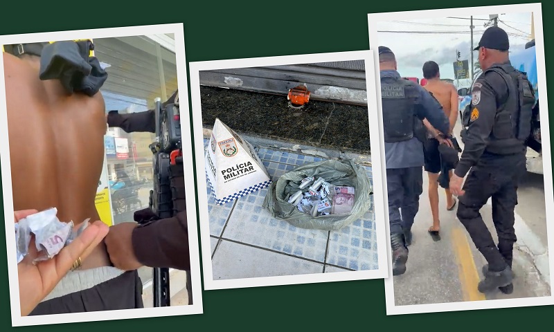 A ação teve início quando a guarnição notou uma movimentação suspeita envolvendo dois ciclistas. O acusado, que estava sem camisa, foi avistado buscando algo em uma sacola pendurada em um poste às margens da via e entregando o material a um senhor. No momento da transação, os policiais observaram o suspeito receber uma nota de R$ 5,00 do comprador.