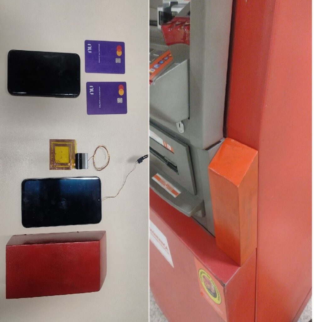 Durante a inspeção, foi detectada a instalação de um dispositivo externo não autorizado que continha um aparelho celular e componentes de tecnologia NFC, frequentemente utilizados em fraudes desse tipo. A presença desse equipamento indicava a intenção de captar informações bancárias de clientes que utilizassem o caixa eletrônico, levando a uma série de débitos indevidos em contas de usuários.