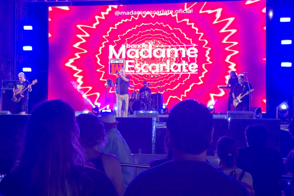 O show da Madame Escarlate, liderado pelo vocalista Felipe Sardenberg, trouxe uma seleção de músicas que marcaram gerações. A banda é composta pelo baixista Ivan Machado, o baterista Robson Rangel e o guitarrista Marcelo Corrêa, além da participação especial do tecladista Charles Soulz. O repertório incluiu faixas icônicas como "Is This Love", do Whitesnake, e "Pro Dia Nascer Feliz", do Barão Vermelho, que garantiram a animação do público desde o início da apresentação.