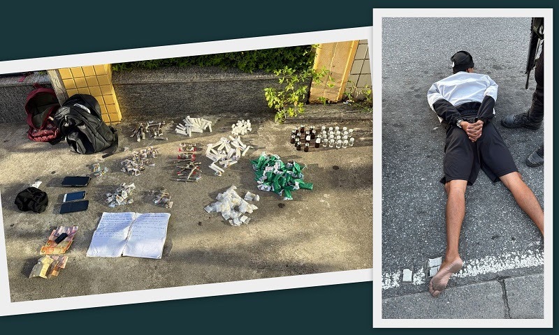 Durante a abordagem, o motorista do veículo se identificou como policial militar e relatou que havia sido rendido por um criminoso que estava no banco do carona. O suspeito o forçou a dirigir para fora da área cercada. O passageiro, descrito como usando um casaco branco e touca preta, foi revistado e, durante a busca, foi encontrada uma mochila contendo uma quantidade significativa de drogas.