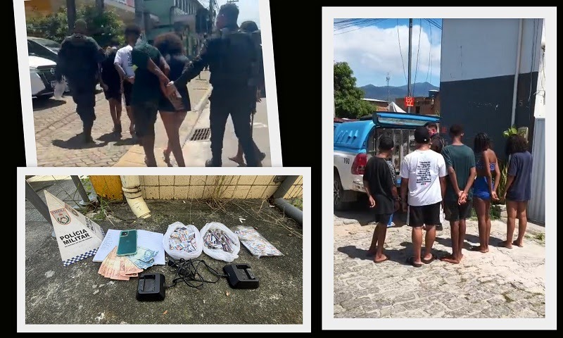 Os policiais militares realizavam um patrulhamento de rotina quando perceberam uma movimentação suspeita na Travessa 4, próxima ao Beco 8, em Serramar. Durante a abordagem, a guarnição notou três indivíduos sendo cercados por dois homens em bicicletas. Ao se aproximarem, os policiais observaram que os suspeitos estavam realizando trocas rápidas de objetos com os ciclistas, que, ao avistarem a viatura, tentaram fugir do local. Os três indivíduos, em seguida, se refugiaram em um quintal onde estavam mais dois comparsas.