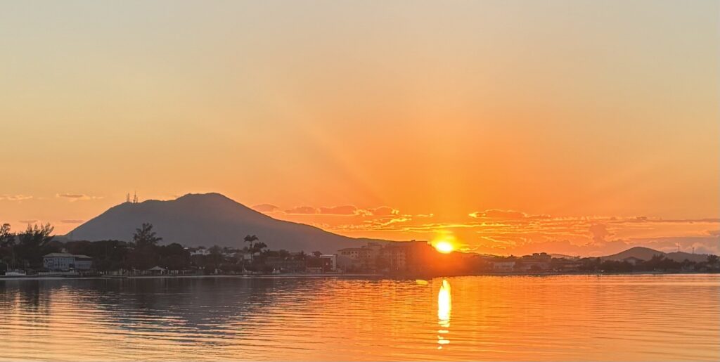 O sol irradia a Laguna de Araruama, transformando a água em um espelho reluzente e revelando uma paisagem antes considerada distante. A revitalização da área, antes marcada pela poluição, tornou-se motivo de orgulho para a população da Região dos Lagos.