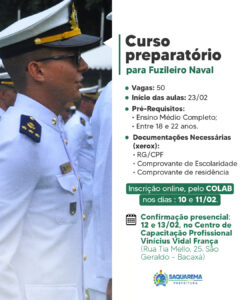 Os interessados em participar do curso "Preparatório Militar – Fuzileiro Naval" devem acompanhar as orientações da Prefeitura de Saquarema. As inscrições poderão ser feitas através de um formulário online ou de forma presencial no Centro de Capacitação Profissional Vinicius Vidal França. É importante que os candidatos preparem toda a documentação necessária antecipadamente para facilitar o processo. A Prefeitura incentivará a participação de todos os jovens que atendam aos requisitos, buscando formar uma turma diversificada e engajada.