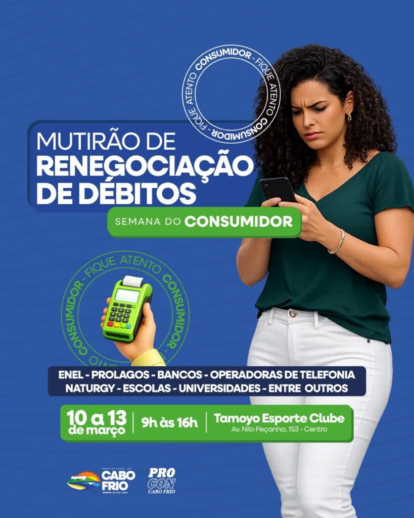 O Procon Cabo Frio anunciou a realização da segunda edição do Mutirão de Renegociação de Débitos, um evento que oferece aos consumidores a oportunidade de regularizar suas pendências financeiras com credores em condições especiais. O mutirão ocorrerá entre os dias 10 e 13 de março, no salão do Tamoyo Esporte Clube, localizado no Centro da cidade. A iniciativa coincide com as comemorações do Dia do Consumidor, celebrado em 15 de março, e visa facilitar o acesso dos cidadãos a acordos vantajosos para quitação de dívidas.