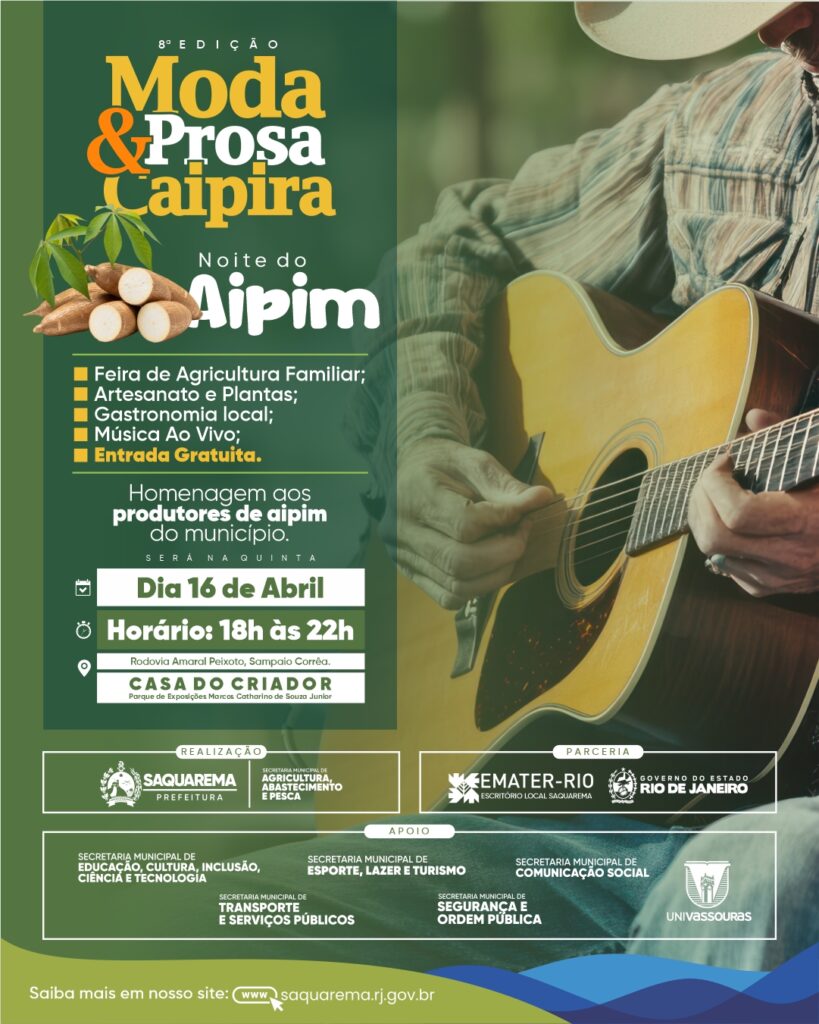 Saquarema se prepara para receber a 8ª edição do evento “Moda & Prosa Caipira – Noite do Aipim”, marcado para o próximo dia 16 de abril, em Sampaio Corrêa. A iniciativa da Prefeitura local promete reunir moradores e visitantes da Região dos Lagos em uma celebração gratuita da cultura raiz, com destaque para a versatilidade do aipim.